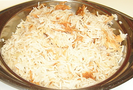 Sauté the onion and garlic in the oil. Add the rice and stir-fry. Add the water and salt. Bring to a boil, then lower the heat and cover the pan. Cook until ready, then let rest for 10 minutes.