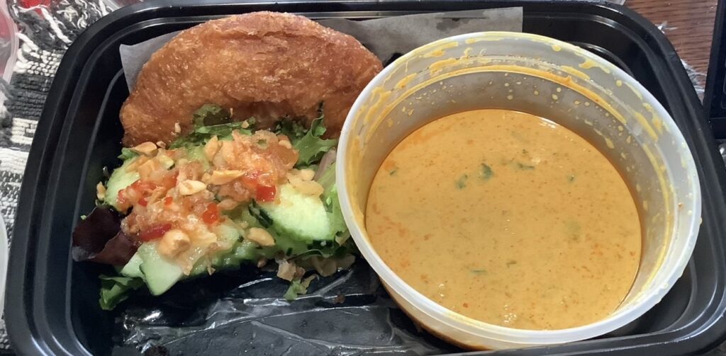 Mike had the roti mataba ($15), a “crispy roti stuffed with curried potato and ground chicken,” which came with yellow curry, ajad (Thati cucumber salad) and a samosa. He enjoyed all of them very much. They were too spicy for my taste, but I’m a lightweight.