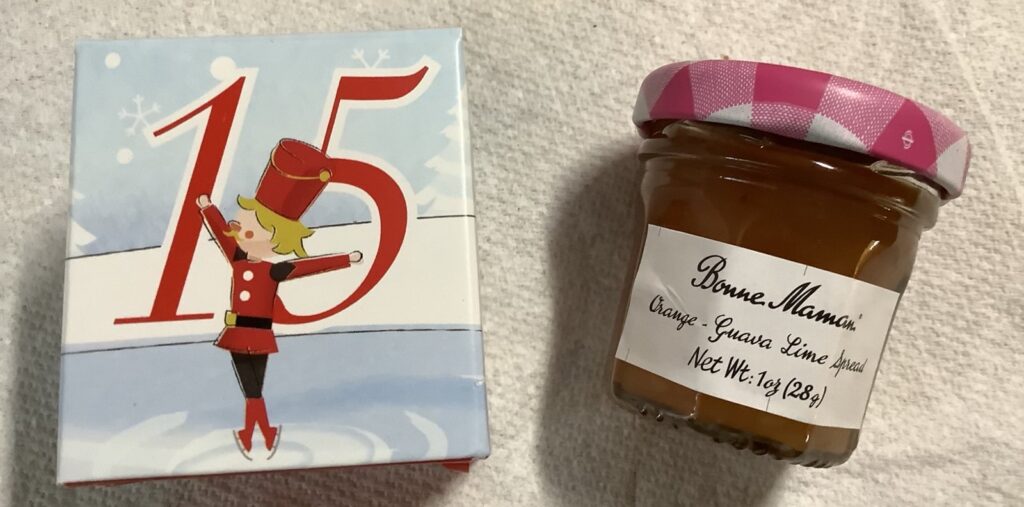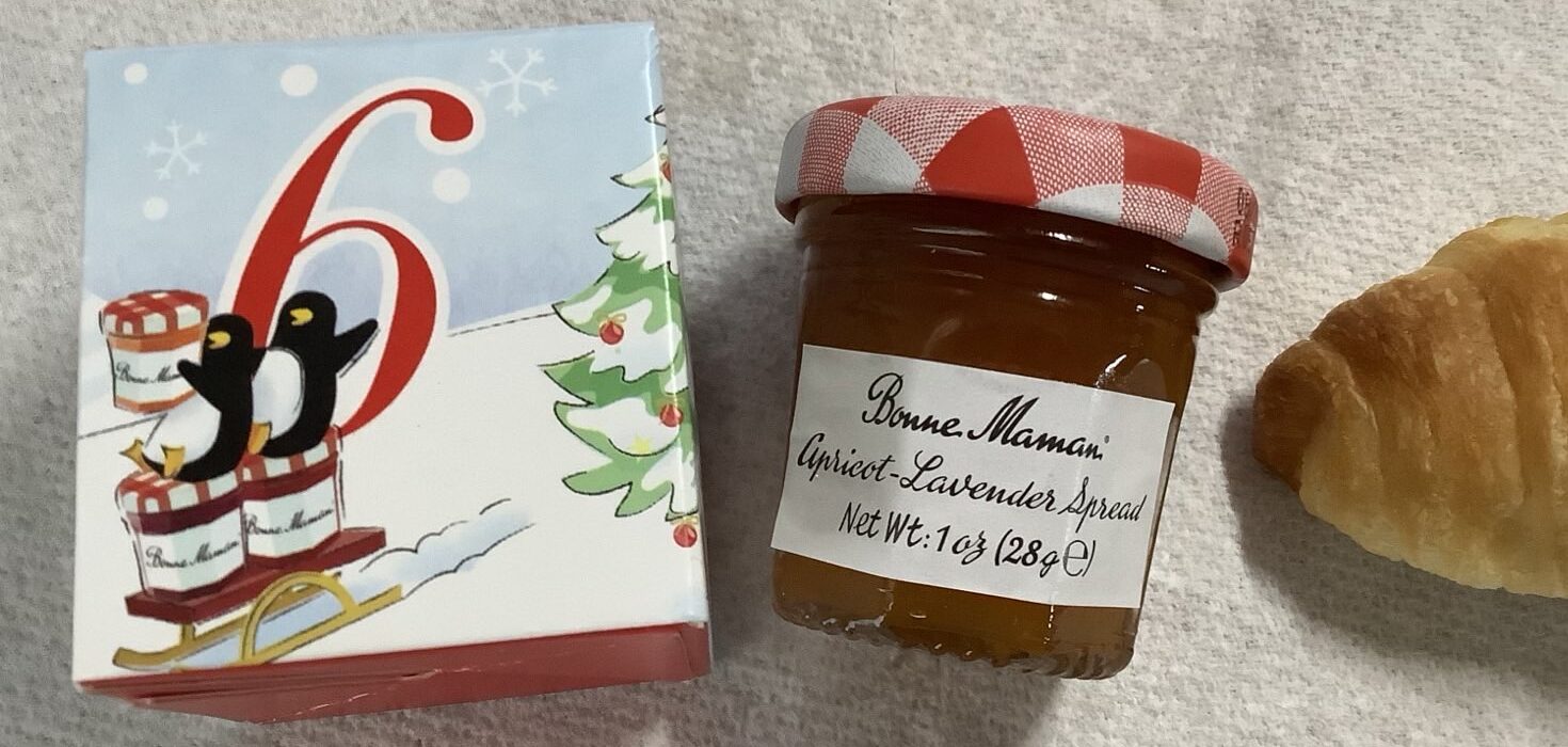 Bonne Maman has done a great job of not only creating a plethora of new jam flavors for the calendar, but of pacing them so that every day you go to a pretty different fruit than the day before. That’s how on day 6 we got to Apricot – Lavender spread (apricots, sugar, brown sugar, lavender extract, concentrated lemon juice, fruit pectin). I’ve never been a fan of apricot jam. Like with orange marmalade, apricot jam is what parents and grandparents used to serve when I was a child, and I always suspected that it was because they were cheaper than berry jams. In my middle age, I’ve become to appreciate them more. I do wish that this jam was more fruit forward, but that’s my general impression of all of Bonne Maman’s jams: they are too sweet and therefore they don’t let the flavors of the fruits shine. I did enjoy it on a mini-croissant. That said, I probably wouldn’t buy it and instead would look for a low-sugar version.