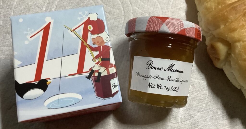 Day 11 and a very different jam today: Pineapple – Rum – Vanilla spread (pineapple, sugar, brown sugar, rum, vanilla extracts, exhausted vanilla seeds, concentrated lemon juice, fruit pectin) . This one I’m not very enthusiastic about. If you eat it by itself, you can taste the pineapple, but not the rum or vanilla. On a croissant, however, it just tasted sweet. Fortunately, it didn’t taste too sweet, but the pineapple flavor was too subtle to distinguish it. As a generic jam, I don’t object to it, but that’s all it is.