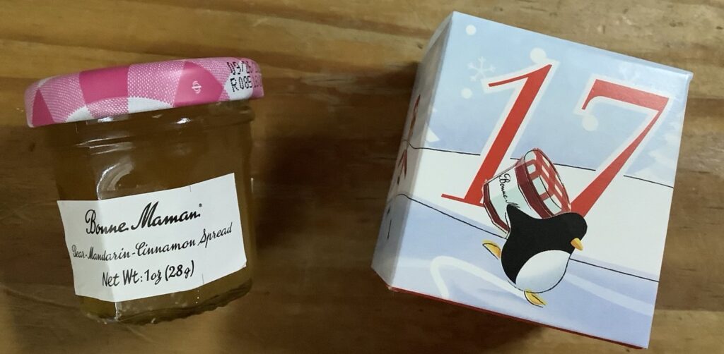 Day 17 brings us a third orangey spread in a row – at least in theory. Today we got a Pear – Mandarin – Cinnamon spread (pears, mandarins, sugar, brown sugar, cinnamon, concentrated lemon juice, fruit pectin). When I tried the jam on a spoon, I couldn’t taste the mandarin at all – not even as in acidity. Instead, this tasted just like a cinnamon pear jam. I’m not a huge fan of cinnamon, so I didn’t enjoy it as much as I wished. On a croissant, on the other hand, the cinnamon was almost imperceptible and the mandarin shined. I liked it far better.