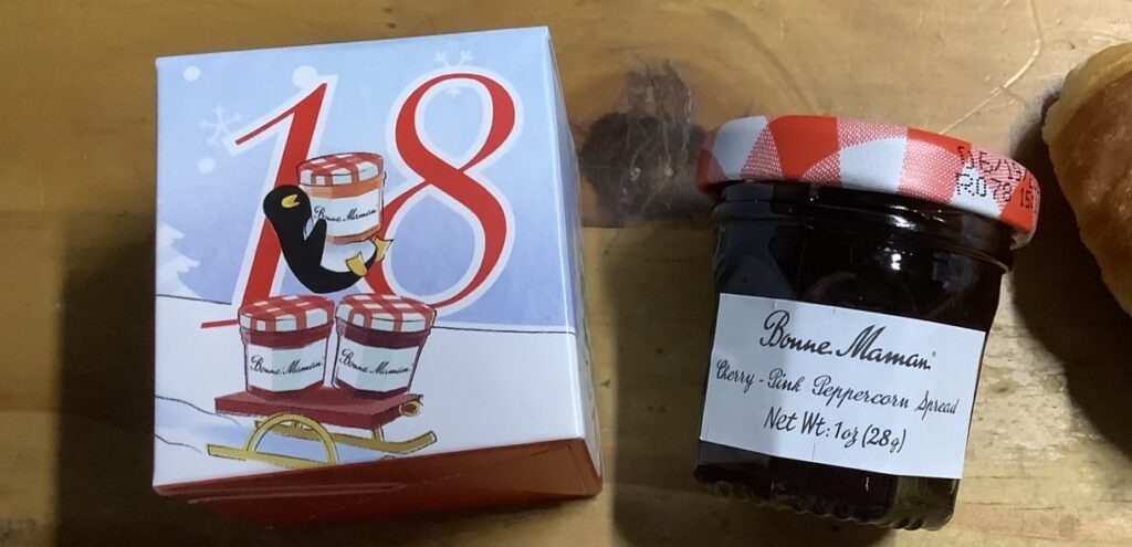 It’s cherry spread again on Day 18. To be precise, today we got Cherry – Pink Peppercorn Spread (black cherries, morello cherries, sugar, brown sugar, pink pepper, concentrated lemon juice, fruit pectin). I have to say it wasn’t my favorite. I didn’t mind the cherry flavor itself, I’m not sure I could tell it was cherry, but the flavor of the pepper was very distinctive. I just don’t like the taste of peppercorns. If you do, you probably will like this jam. It wasn’t actually spicy either, though I wouldn’t necessarily have minded some heat.