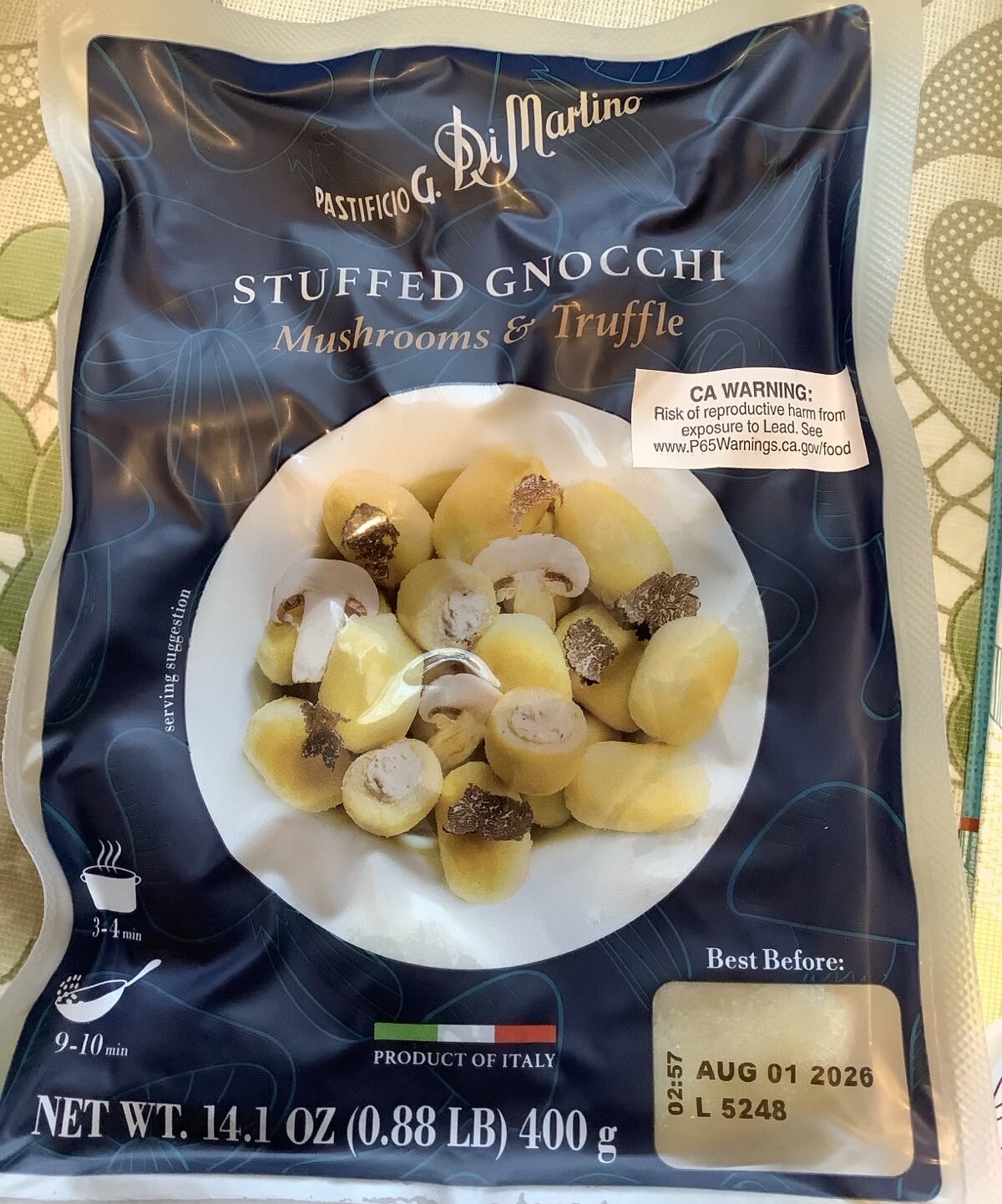 It wasn’t until I came home that I noticed the Prop 65 warning in the package: the gnocchi have lead in them! There is no safe level of lead exposure, and the consumption of even a standard portion of lead contaminated mushrooms can have negative health effects. Lead is particularly problematic for children, who absorb a far greater proportion of it than adults. Before this purchase, I had not realized how mushrooms – in particular dried wild mushrooms – often contain lead as I hadn’t seen the Prop 65 warning before. I probably wouldn’t have bought the package if I had noticed it, but I decided to make them for myself anyway.