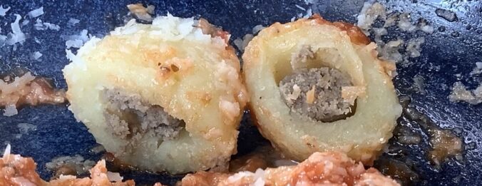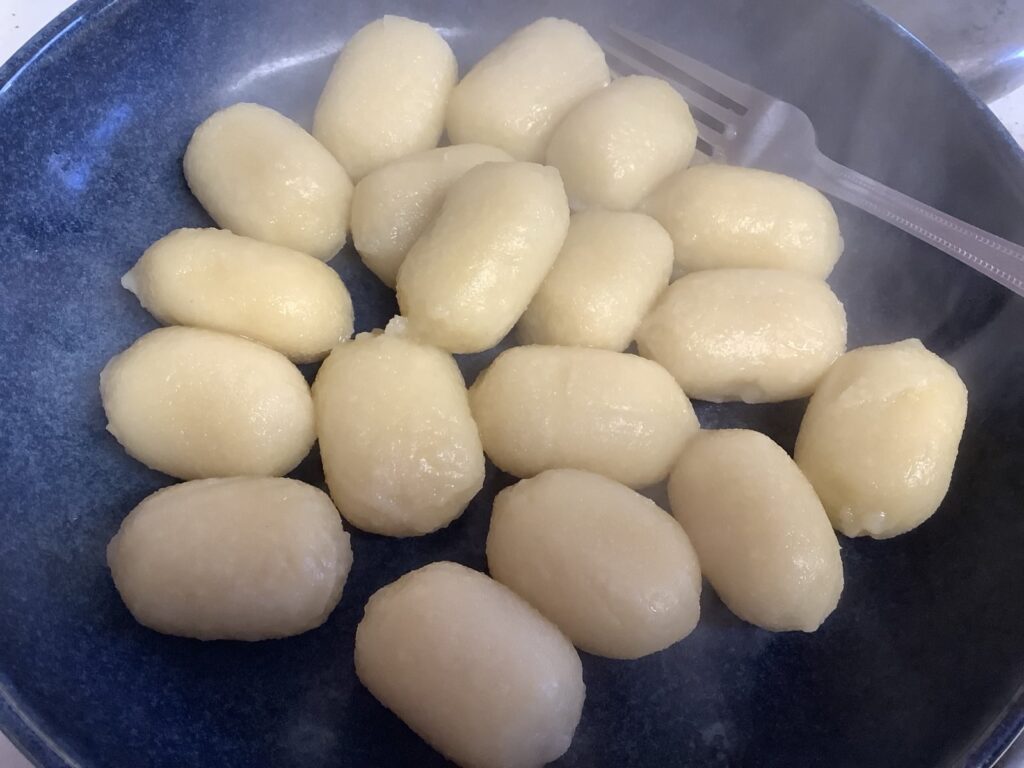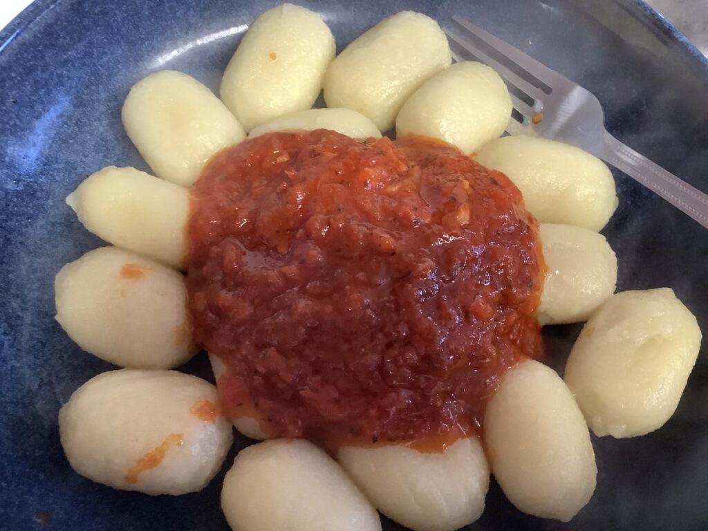 I shouldn’t have bothered. The gnocchi were a complete failure. The gnocchi themselves were simply not tasty. Even though I cooked them in salted water, they hadn’t really absorbed it and were in need of it and probably some type of spicing. The texture was very dry and even powdery, perhaps because they were made with dried potato flakes rather than fresh potatoes. The filling suffered from the same issue, it was very dry and had a strange consistency. Its main ingredient is ricotta cheese, and it really didn’t taste much of mushroom.