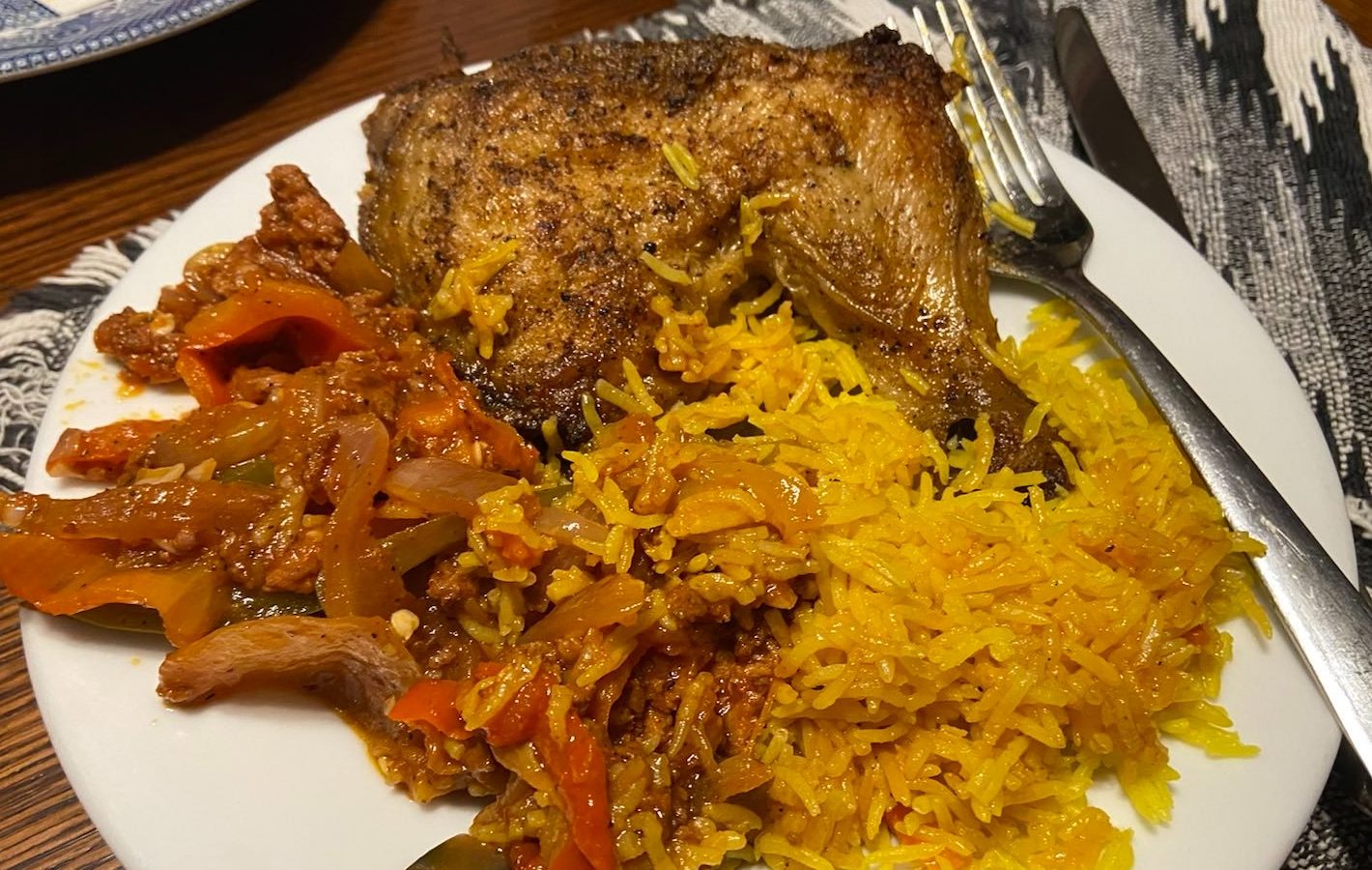 The chicken was undercooked, and close to raw near the bone area. The rice and peppers, which I tried before I cut into the chicken, were quite good, the rice was standard yellow rice and the peppers were nicely stewed/spiced and not too spicy. It would be a good dish if the chicken was cooked properly.